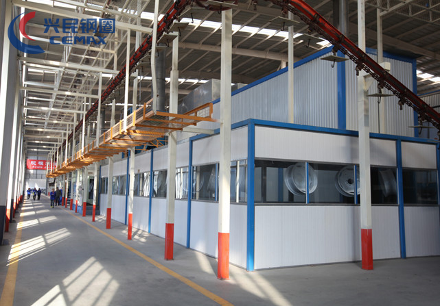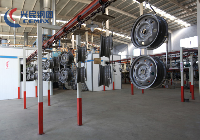 Xingmin paint workshops possess state of painting line. The line utilizes the tatest technology in the pretreatment of electrophoresis. The anticorrosion performance conforms to the international standards. Xingmin is the first wheel company in China to use a chain conveyor line for electrostatic powder coating, which makes coating automatic. Robotic arms load and unload product on the conveyor line. The finished products go directly to the warehouse for packing, which eliminates possible wear and tear.